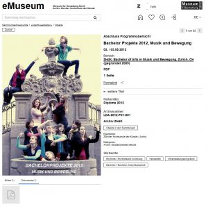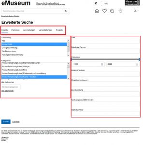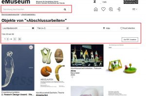 Zudem ist eMuseum neu in der Nebis recherche im Tab „Bücher, Zeitschriften, Bilder, …“ eingebunden. Es ist über den Bibliotheksfilter „ZHdK-MIZ“ und in der normalen Suche über die Facette Sammlung „ZHdK eMuseum“ anwählbar.