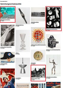 Auf der Startseite ist das Menu oben rechts zu finden. Verschiedene thematische Zugänge und Informationen erleichtern den Einstieg: „Im Fokus“, „Sammlungsschwerpunkte“ und „Ausstellungsarchiv“ geben einen ersten Einblick in wichtige Bestände des Archivs der ZHdK und der Sammlungen des Museum für Gestaltung.