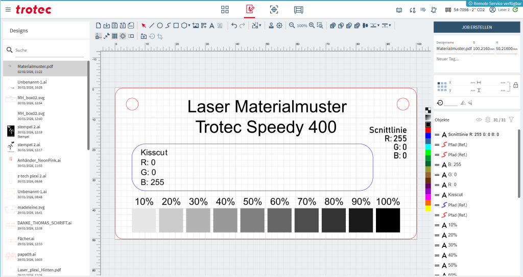 Wenn eure Zeichnung so weit vorbereitet ist, könnt ihr oben links JOB ERSTELLEN anwählen und erhaltet anschliessend die Übersicht des Lasertisches mit eurem Laser-Job.