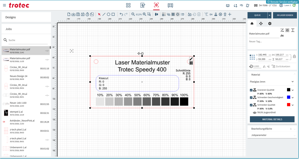 Der Job wird auf dem Tisch platziert und ausgerichtet, die Materialsettings werden ausgewählt und der Job wird zum Laser gesendet.