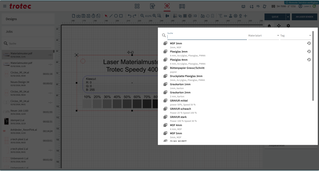 Diese sind rechts im Bereich Materialien hinterlegt und definieren insbesondere die Bearbeitungsgeschwindigkeit sowie die Laserleistung, welche notwendig ist um ein definiertes Material in einer bestimmten Stärke zu schneiden.