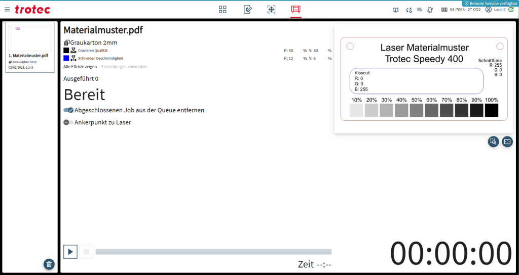 Die Übersicht zeigt den aktuellen Job in der Warteschlange des Lasers. Der Job muss am Terminal des Lasergerätes gestartet werden.