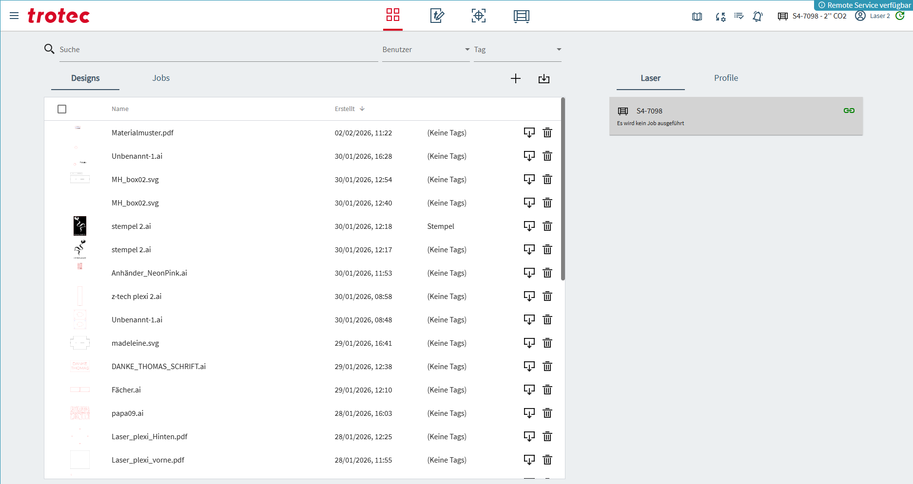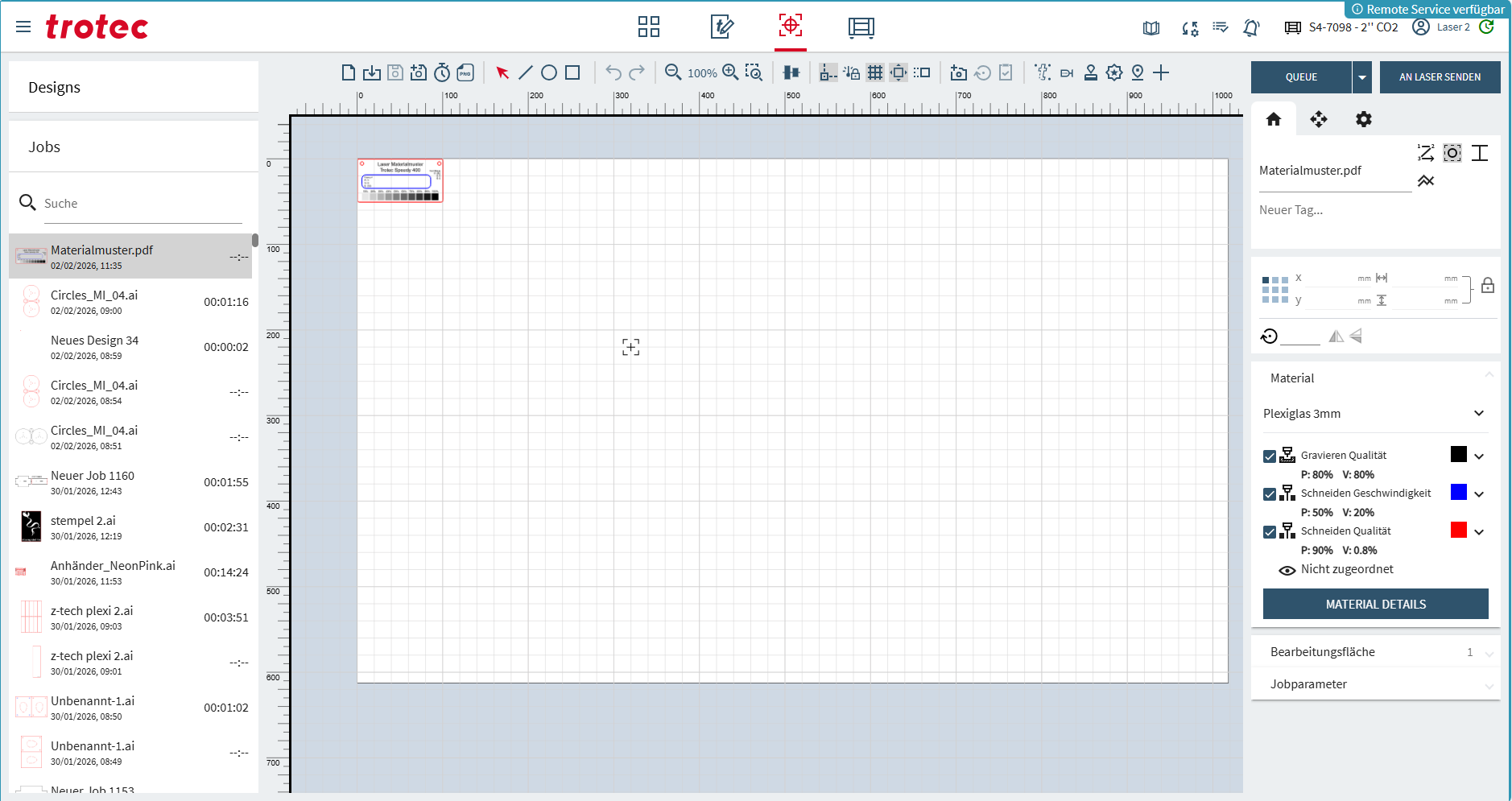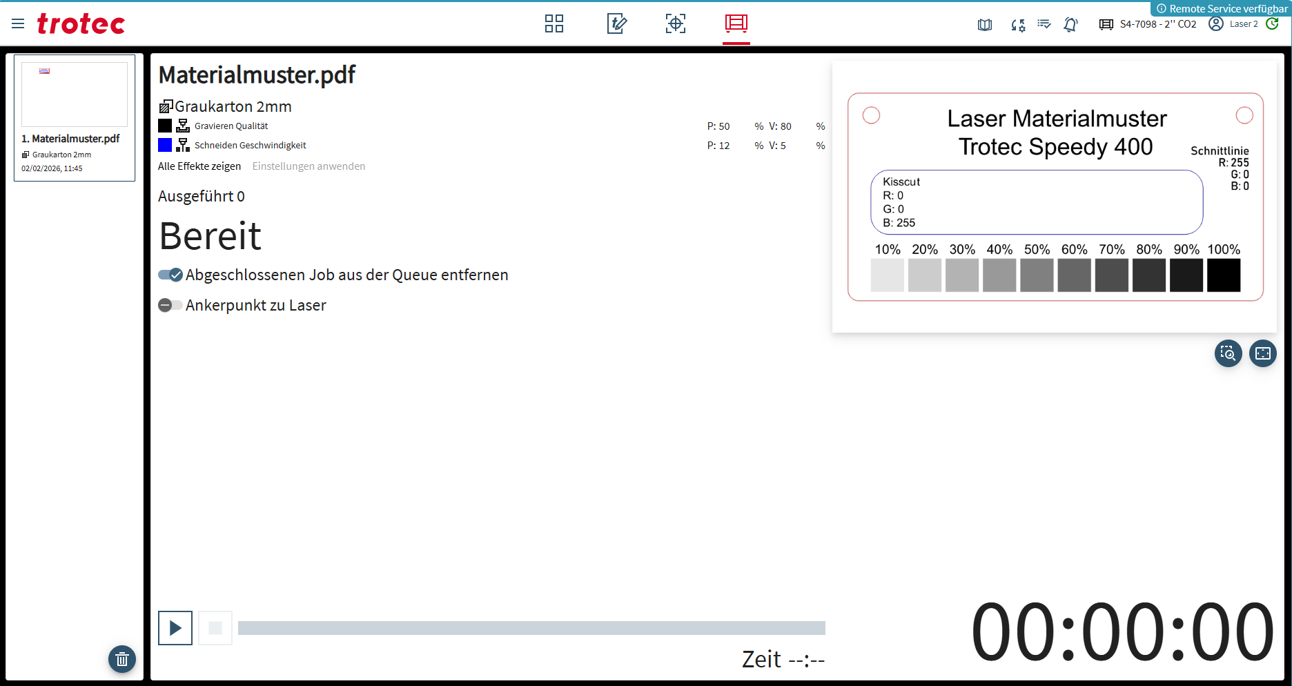 Die Übersicht zeigt den aktuellen Job in der Warteschlange des Lasers. Der Job muss am Terminal des Lasergerätes gestartet werden.