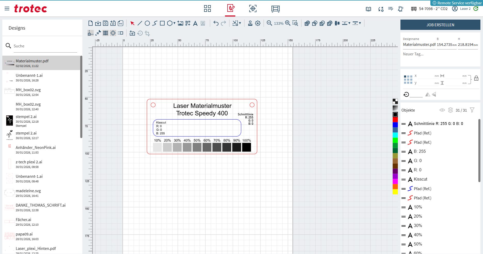 Wenn eure Zeichnung so weit vorbereitet ist, könnt ihr oben links JOB ERSTELLEN anwählen und erhaltet anschliessend die Übersicht des Lasertisches mit eurem Laser-Job.