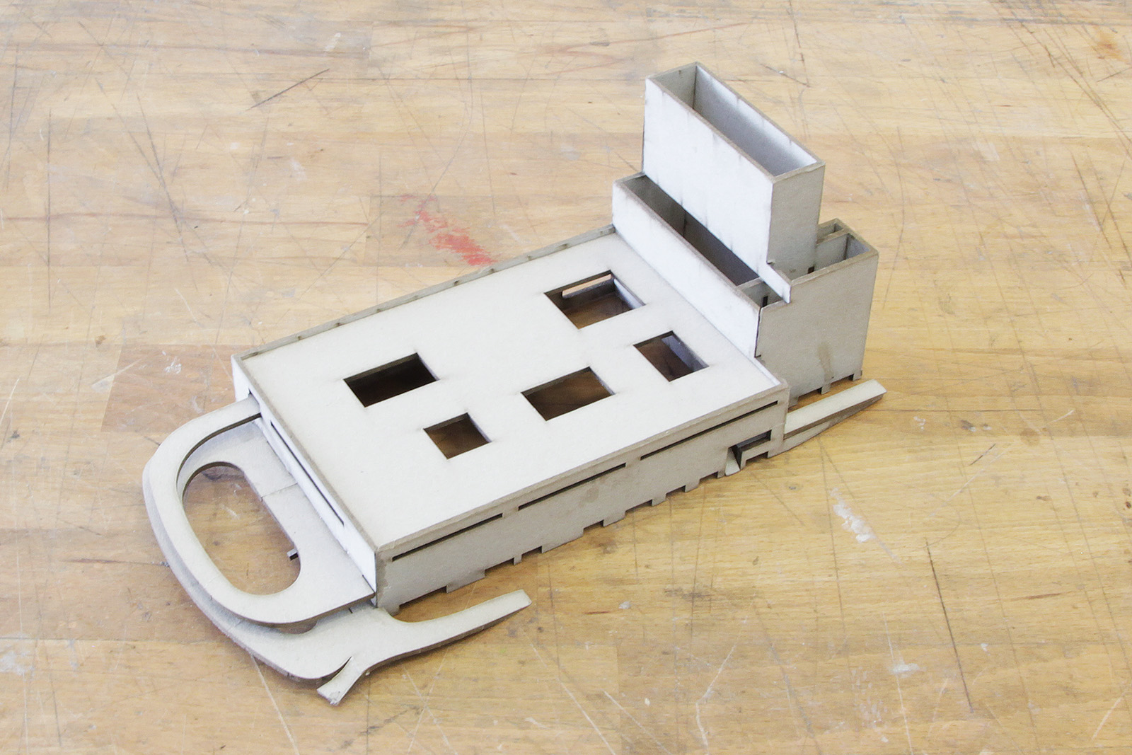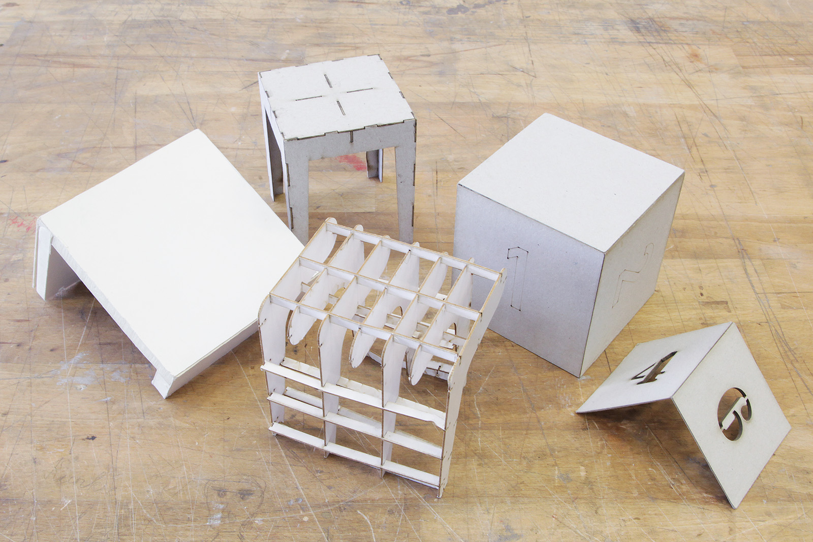 Karton und Papier sind nachhaltige und kostengünstige Materialien für Entwurfsarbeiten und Modellbauprojekte jeglicher Art. Karton kann flächig aufgebaut, einfach verklebt und zu Volumenobjekten zusammengesetzt werden. Das Material kann von Hand verarbeitet, aber auch optimal mit dem Lasercuter in Form geschnitten werden.