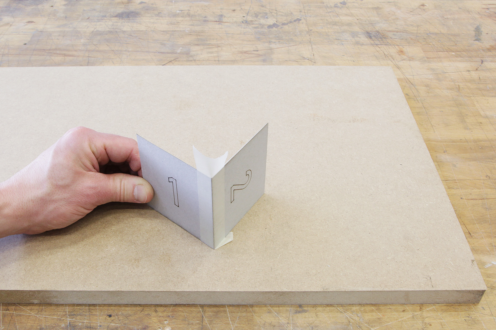 Beim Zusammenfügen von Volumenkörpern aus Karton ist es häufig wünschenswert, die Kanten auf Gehrung auszuführen. Da es jedoch umständlich ist, Karton direkt auf Gehrung zu schneiden, greift man im Modellbau oft auf einfachste Werkzeuge zurück, um diese nachträglich anzuschleifen und zu verkleben.