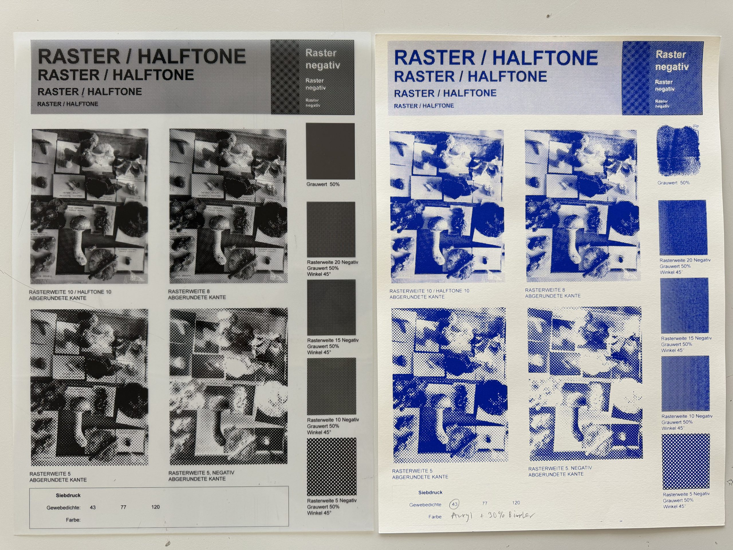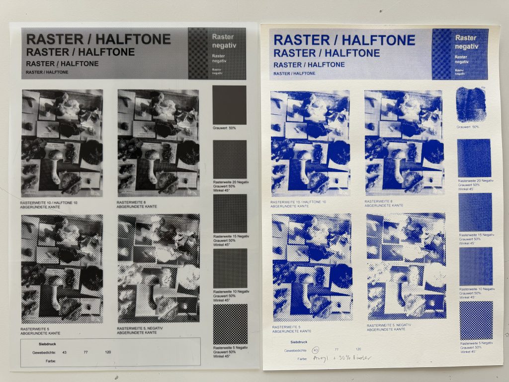 Eine Siebdruckvorlage kenn kennt immer nur zwei Zustände, Farbe oder keine Farbe. Zwischentöne wie im Tiefdruck gibt es nicht. Um Grauwerte, Abstufungen und Zwischentöne zu erhalten können Motive digital gerastert werden. Diese Umwandlung nennt man Halbtonrasterung. Dieser Vorgang verwandelt jede Helligkeitsinformation des Motivs in kleinere oder grössere schwarze Punkte.