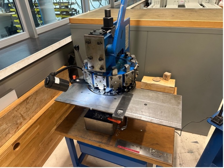 Die Revolverstanze ist ein manuell betriebendes Stanzwerkzeug, das über einen drehbaren Revolverkopf verschiedene Lochdurchmesser oder Formen bereithält. Mit einem Handhebel wird die Stanzkraft erzeugt, sodass Bleche oder dünne Materialien mit Hilfe von Anschlägen und Massskalen präzise gelocht oder ausgestanzt werden können.