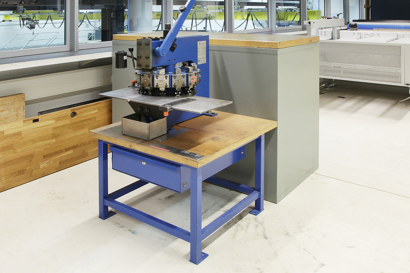 Die Revolverstanze ist ein manuell betriebendes Stanzwerkzeug, das über einen drehbaren Revolverkopf verschiedene Lochdurchmesser oder Formen bereithält. Mit einem Handhebel wird die Stanzkraft erzeugt, sodass Bleche oder dünne Materialien mit Hilfe von Anschlägen und Massskalen präzise gelocht oder ausgestanzt werden können.