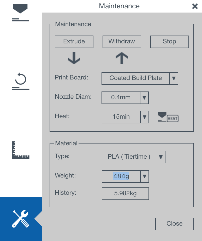 - Wähle bei der Zeile «Material» das entsprechende Filament.