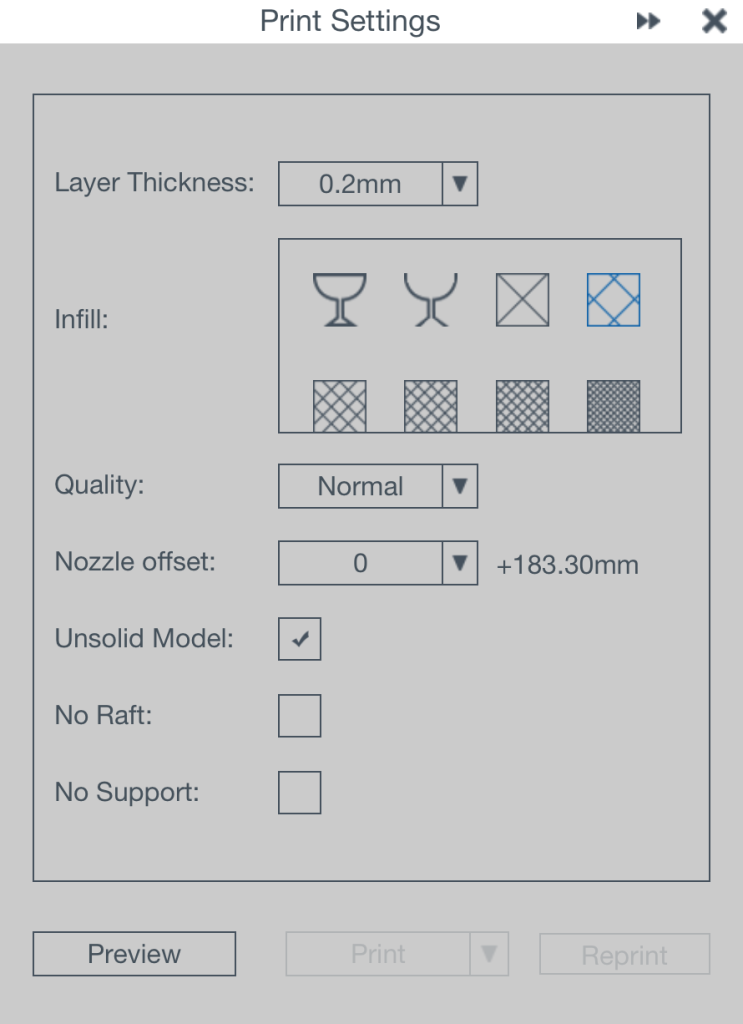 Hier wird über Auswahl der Symbole die Füllung des Drucks gewählt. Die Füllung hat grossen Einfluss auf Stabilität, Materialverbrauch und Druckzeit.